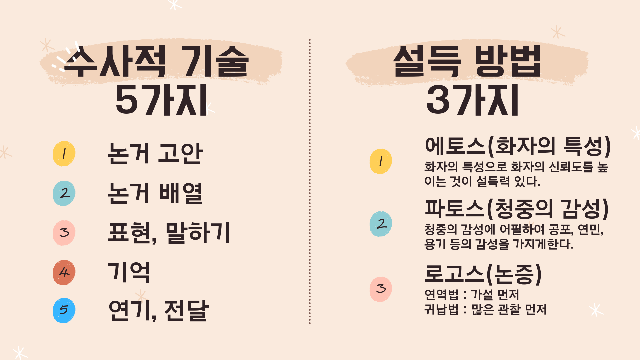 고대 수사학의 핵심은 '설득방법'에 있다. 국가 중대사의 토론에 참여하고 분쟁시 자신이 직접 변호해야 하는 아테네식 직접 민주주의가 고대 수사학 발전의 밑거름이었기 때문이다. 고대 수사학은 문채 수사학(문학적)과 논증 수사학으로 구분하는데 논증 수사학이 커뮤니케이션을 통해 상대방을 설득하는 것이다. 아리스토텔레스는 논증 수사학의 수사적 기술 5가지와 3가지 설득방법(에토스, 파토스, 로고스)를 제시했다.